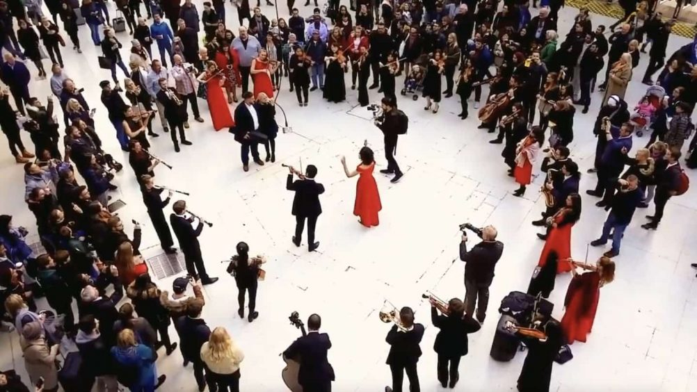 The organizers also assist with location selection. You can choose a place from a suggested list, and the permit fee for its use will then be included in the cost, simplifying the organizational process. Additionally, as mentioned, you can learn a portion of the flash mob yourself if desired. The moment of the proposal itself can also be integrated into the performance. The song choice is left to the client, but the planner can recommend suitable options. Regarding technical support, a sound system is provided for outdoor flash mobs. If the flash mob takes place indoors, the audio file is simply provided to the venue’s administration.